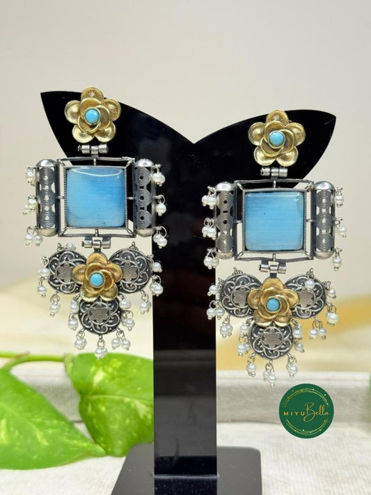 Deepika - Dual Tone Floral Earrings with Sky Blue Centerpiece