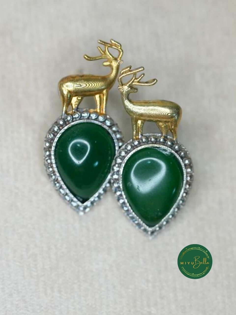The Garima Green Stone Earrings bring together sunlit tones and rustic artistry, featuring a dual-tone antique finish that adds subtle charm to any look.