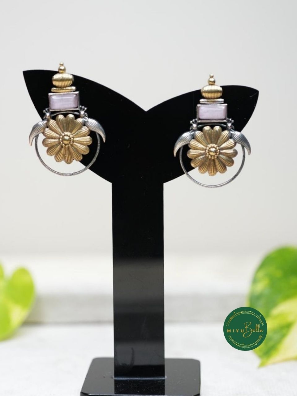 The Garima Dual-Tone Floral Earrings bring vintage beauty to life with a soft blue accent stone, intricate detailing, and a timeless gold-silver contrast.
